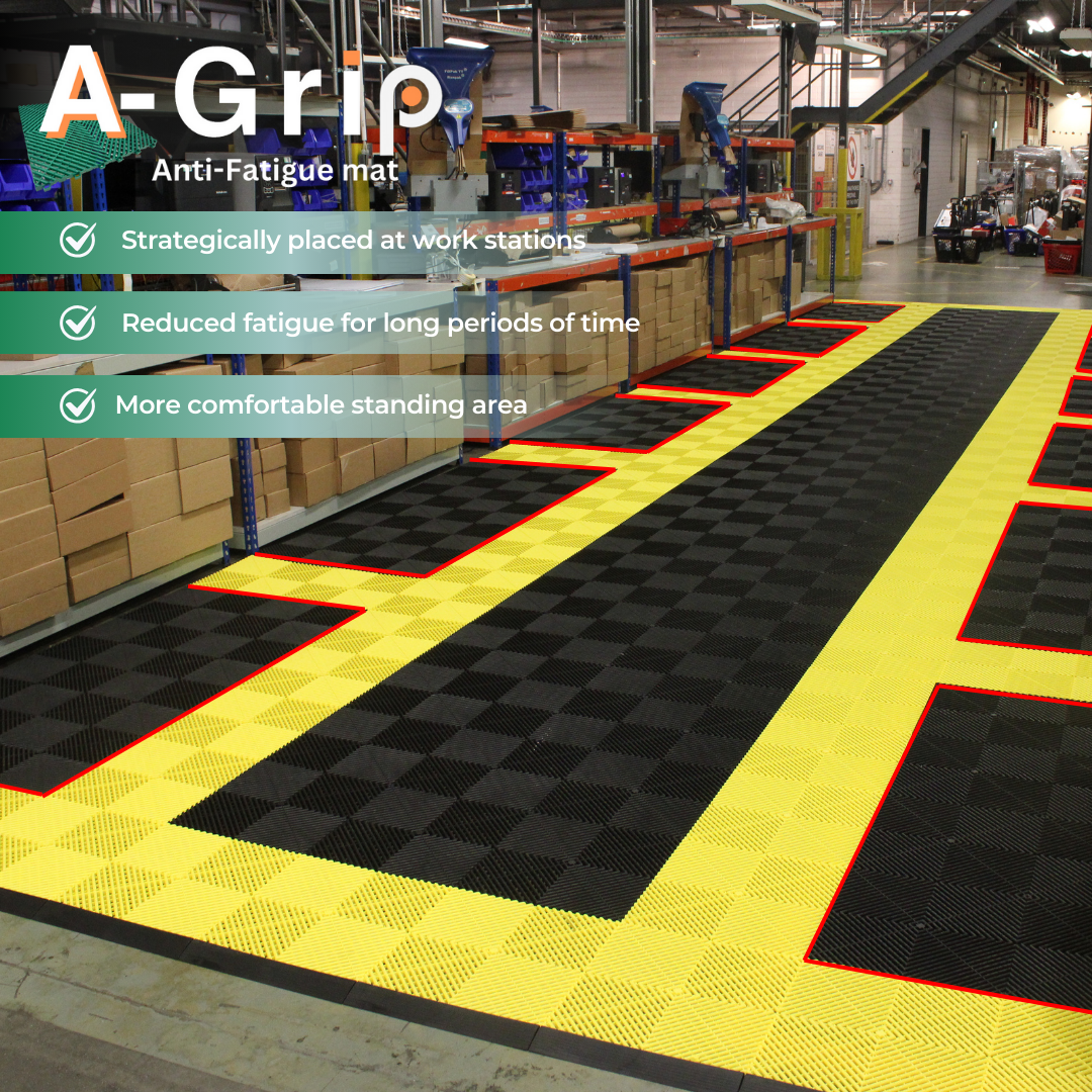 Les employés restent debout pendant de longues périodes. Ces zones sont entourées de dalles ventilées A-Grip, offrant une surface durable, antidérapante et facile d'entretien, idéale pour les sols d'usine.