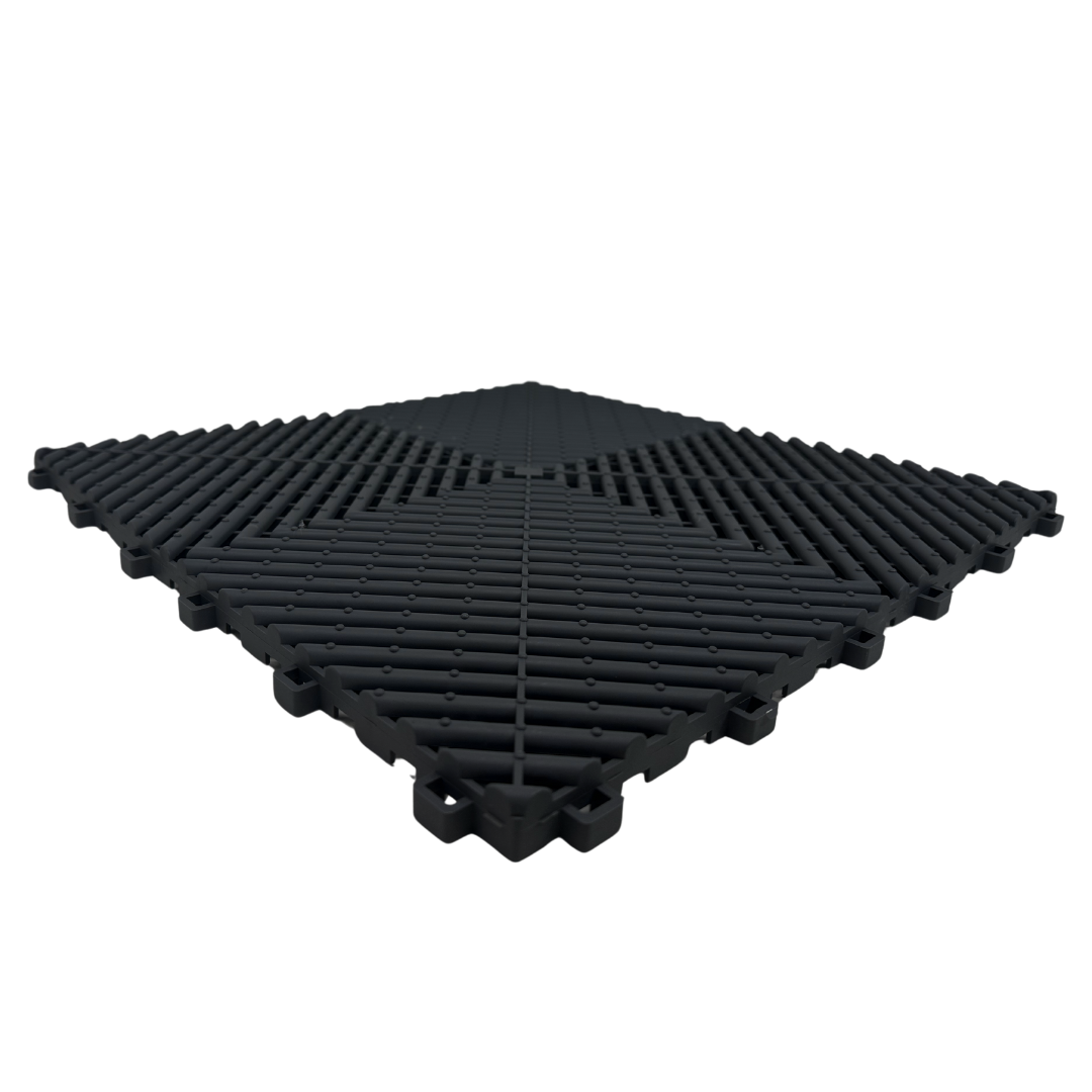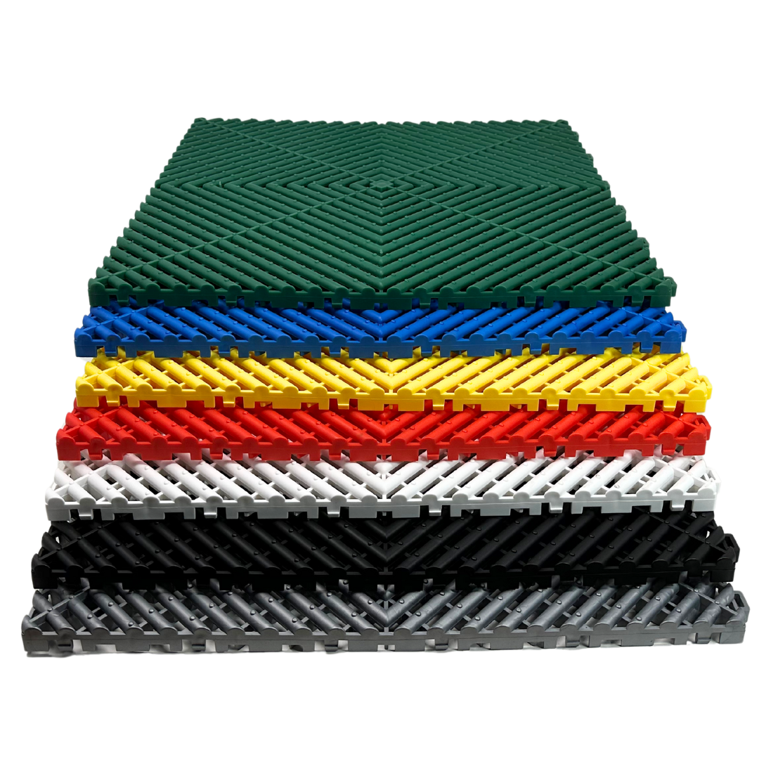 - Revêtement de sol de garage : Idéal pour les garages, ces carreaux ventilés offrent une forte adhérence tout en laissant passer l'eau et les débris, gardant la surface propre et sèche.